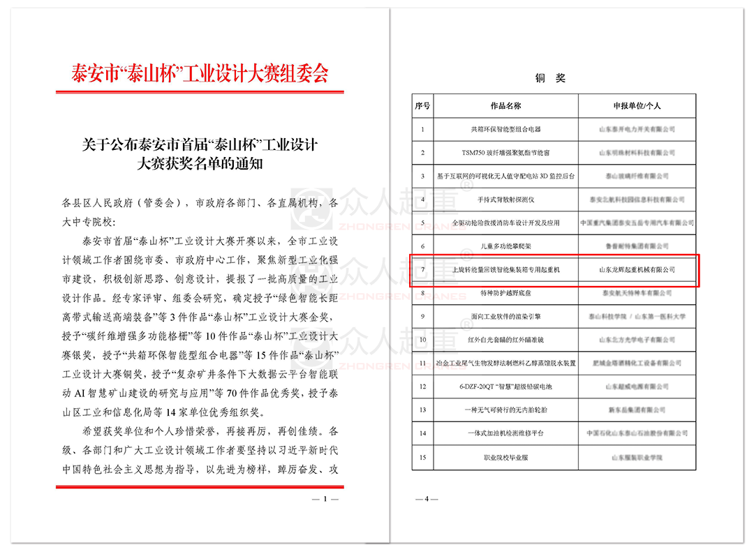 近日,泰安市“泰山杯”工業(yè)設計大賽組委會公布了首屆“泰山杯”工業(yè)設計大賽獲獎名單。山東龍輝起重機械有限公司憑借“上旋轉能量回饋智能集裝箱專用起重機”榮獲本次工業(yè)設計大賽“銅獎”的榮譽稱號。 該產(chǎn)品采用遠程無人化、智能化操作及先進的防搖擺設計,達到國內(nèi)領先水平。其中能量回饋系統(tǒng)將運動中負載上的機械能變換成電能并回送給交流電網(wǎng),節(jié)電率可達15%~45%,2022年入選山東省首臺(套)技術裝備。 企業(yè)通過不間斷的技術融合和產(chǎn)品迭代,為各行業(yè)用戶提供高效可靠的物料搬運解決方案。滿足用戶個性化生產(chǎn)需求的同時,為用戶帶來全新的集裝箱吊運的創(chuàng)新場景體驗。 公司建有山東省一企一技術研發(fā)中心、市級工業(yè)設計中心等多個研發(fā)創(chuàng)新載體,被譽為國家高新技術企業(yè)。經(jīng)過三十多年的發(fā)展,現(xiàn)已成為擁有完整產(chǎn)品線和產(chǎn)業(yè)鏈的行業(yè)內(nèi)桿企業(yè)。 堅持以客戶為中心,將功能和創(chuàng)新理念融入到每項產(chǎn)品設計中。此次獲評,充分展現(xiàn)了龍輝起重在工業(yè)設計領域的引領性和創(chuàng)新性,更是近年來企業(yè)高質(zhì)量發(fā)展的一個縮影。 未來,公司將繼續(xù)深耕科技創(chuàng)新,為創(chuàng)建科技型、質(zhì)量型、發(fā)展型、學習型企業(yè),努力奮斗! |